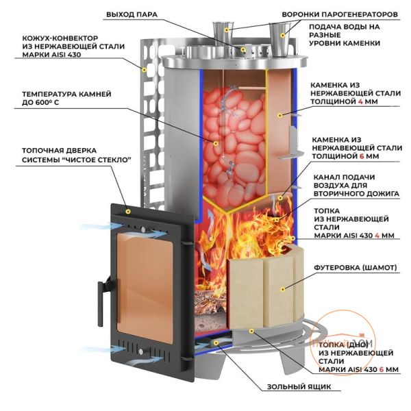 Конструкция печи включает в себя закрытую каменку из нержавеющей стали марки AISI-430 толщиной 4-6 мм, расположенную в верхней части топки. Каменка размещена прямо на пути пламени и дымовых газов, что позволяет нагреть камни до температур свыше 600 градусов по Цельсию.