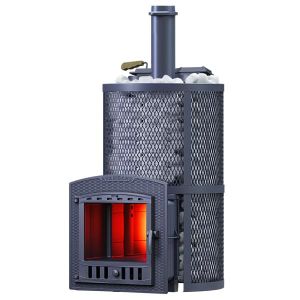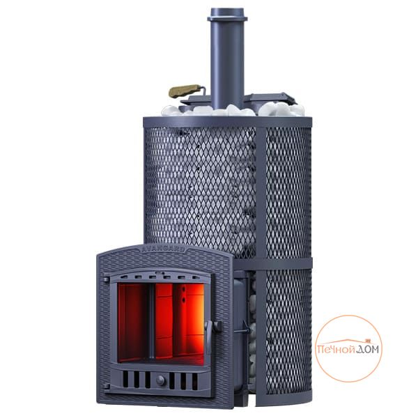 Масса пароиспарителя в печи AVANGARD 62 кг, и он нагревается прямым контактом с пламенем. У пароиспарителя 2 поверхности с увеличенной рабочей площадью – снизу идёт нагрев огнём, а сверху поддаётся вода для пара. У печи уникальная, массивная каменка с теплонакопительными воронками, для получения легкого пара.