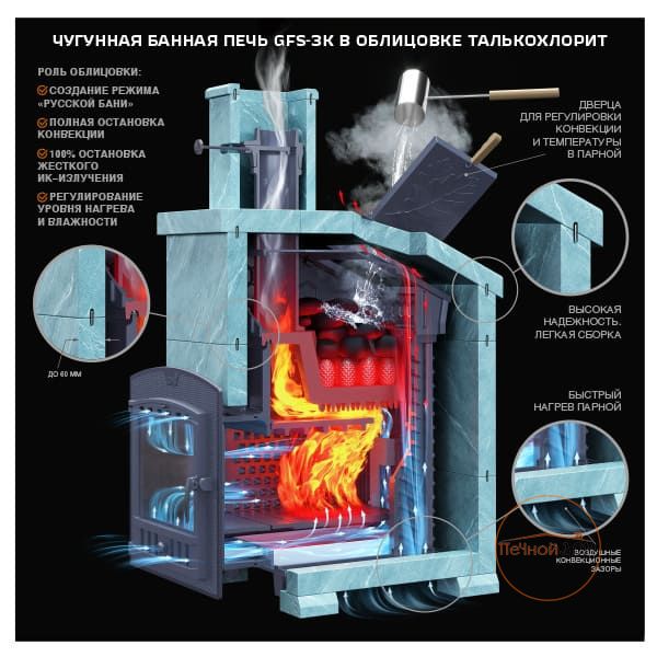 GFS-ЗК 30 - печь с усиленной каменкой большей массы, с единым углублением внутрь топки для дополнительной укладки чугунного заряда. Теплосъемные шипы, со стороны горения пламени, в разы увеличивают площадь соприкосновения огня с каменкой и ускоряют передачу тепла, а также способствуют лучшему дожигу смешивая потоки пламени и воздуха поступаемого из воздушника. Эти усовершенствования значительно повышают мощность парообразования печи и выдают большее количество пара при непрерывной подаче воды. Каменка печей GFS-ЗК является незаливаемой.