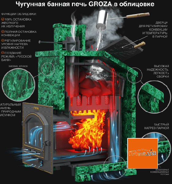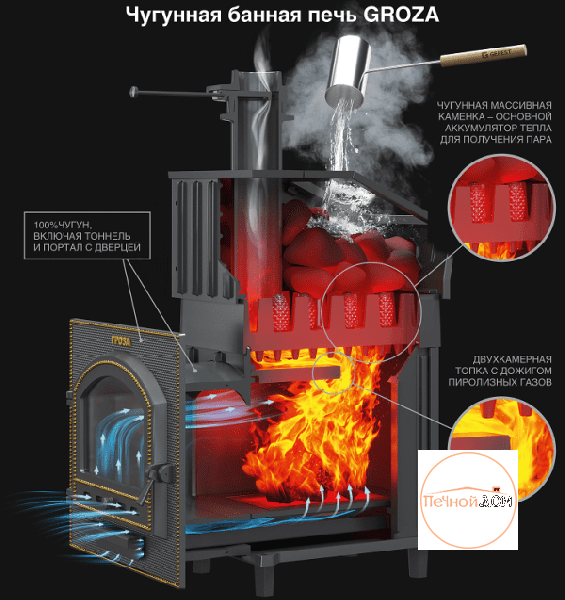 Чугунные банные печи ТМ «Гроза» — это современные печи, рассчитанные на малые и средние размеры парных. Печь имеет прочную сборную конструкцию, без резьбовых и сварных соединений, детали выполнены из легированного чугуна. Топка печей «Гроза» состоит из двух камер, разделенных пламегасителем. Радиаторные выступы каменки, направленные вглубь топки, увеличивают площадь контакта огня с каменкой и эффективность теплосъема. Для увеличения площади поверхности нагрева камней каменка снаружи оборудована чугунными шипами, направленными вверх. Между шипами укладываются банные камни или дополнительные чугунные заклады, такие как ядра и чугунные шишки. Сами чугунные шипы также являются частью заряда для лучшего испарения воды.