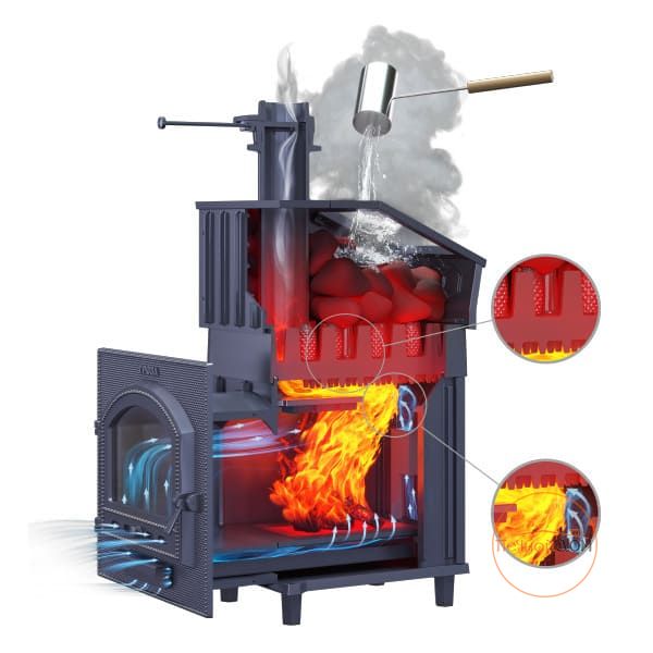 Чугунные банные печи ТМ «Гроза» — это современные печи, рассчитанные на малые и средние размеры парных. Печь имеет прочную сборную конструкцию, без резьбовых и сварных соединений, детали выполнены из легированного чугуна. Топка печей «Гроза» состоит из двух камер, разделенных пламегасителем. Радиаторные выступы каменки, направленные вглубь топки, увеличивают площадь контакта огня с каменкой и эффективность теплосъема. Для увеличения площади поверхности нагрева камней каменка снаружи оборудована чугунными шипами, направленными вверх. Между шипами укладываются банные камни или дополнительные чугунные заклады, такие как ядра и чугунные шишки. Сами чугунные шипы также являются частью заряда для лучшего испарения воды.