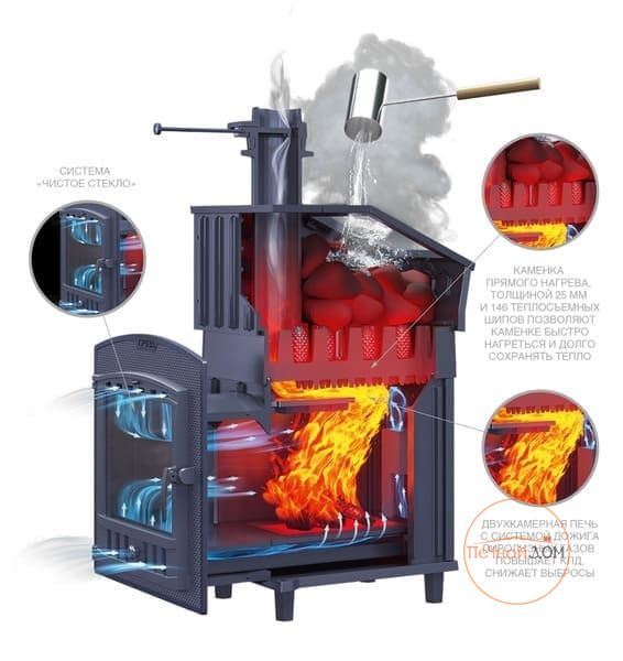 Чугунные банные печи GROZA — это современные печи, рассчитанные на малые и средние размеры парных. Печь имеет прочную сборную конструкцию, без резьбовых и сварных соединений, детали выполнены из легированного чугуна. Топка печей GROZA состоит из двух камер, разделенных пламегасителем. Радиаторные выступы каменки, направленные вглубь топки, увеличивают площадь контакта огня с каменкой и эффективность теплосъема.