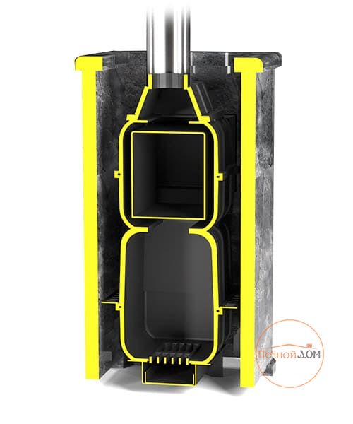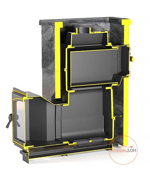 Данную модель печи отличает от аналогов то, что закрытая каменка расположена внутри топки. Это позволяет максимально быстро и хорошо прогревать камни, которые расположены внутри каменки. На камни через специальную трубку с отверстиями поддается вода, которая моментально испаряется, превращаясь в мелкодисперсный пар.