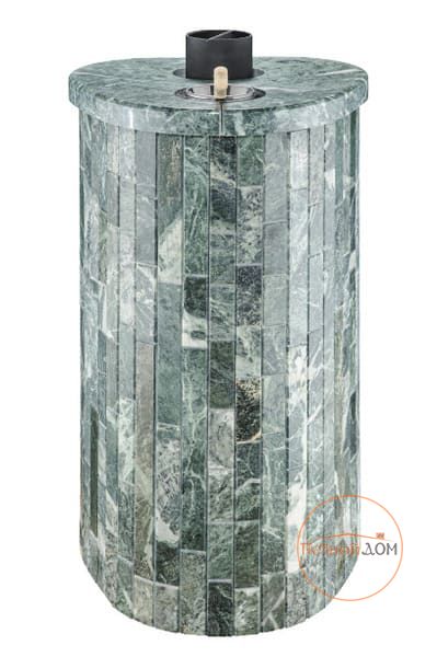 Облицовка печи – ламели из натурального камня, установленные вокруг всего корпуса. Камень блокирует распространение инфракрасного излучения, защищает парильщиков от случайного прикосновения к раскаленному металлу топки. Производство ламелей ведется по собственной запатентованной технологии завода Vöhringer.