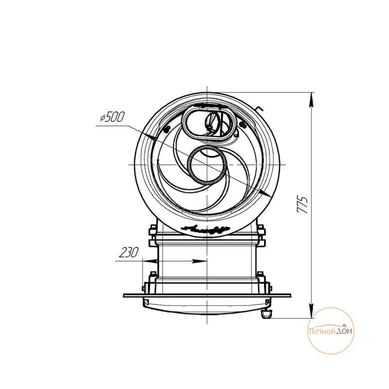 Форма топки с винтовыми каналами закручивает пламя, пламя совершает 3 оборота по топке,а не сразу уходит в трубу, тем самым увеличивая КПД печи на 30%. Два отверстия в топочной дверке для подачи воздуха на горение дают возможность регулировки подачи воздуха, для выбора колосникового и подового горения и позволяют эксперементировать с режимами подготовки парной и выбором процедуры парения. Колосниковое дно с отверстиями позволяет получить равномерное горение по всей площади дна, полноценный прогрев боковых стенок без зон локального перегрева. Подача воды в каменку осуществляется через удобную заливную горловину. Вода проходит через специальный разбрызгиватель внутрь закрытой каменки, где происходит мелкодисперсное орошение горячих камней.