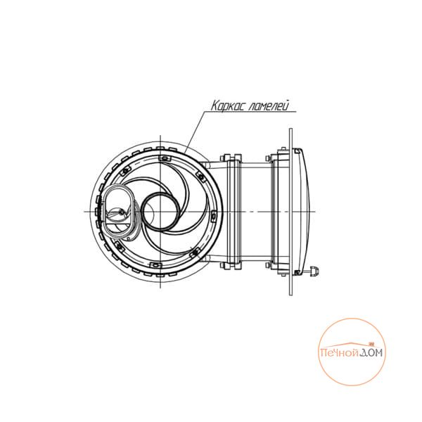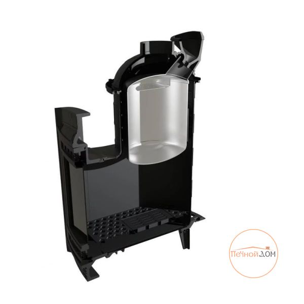 Форма топки с винтовыми каналами закручивает пламя, пламя совершает 3 оборота по топке,а не сразу уходит в трубу, тем самым увеличивая КПД печи на 30%. Два отверстия в топочной дверке для подачи воздуха на горение дают возможность регулировки подачи воздуха, для выбора колосникового и подового горения и позволяют эксперементировать с режимами подготовки парной и выбором процедуры парения. Колосниковое дно с отверстиями позволяет получить равномерное горение по всей площади дна, полноценный прогрев боковых стенок без зон локального перегрева. Подача воды в каменку осуществляется через удобную заливную горловину. Вода проходит через специальный разбрызгиватель внутрь закрытой каменки, где происходит мелкодисперсное орошение горячих камней.