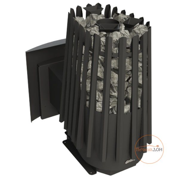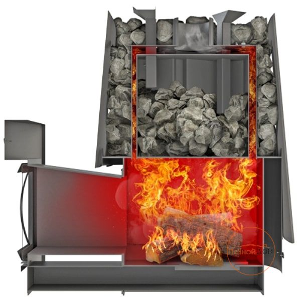 Особенностью печи является наличие закрытой каменки, где камни нагреваются до 400°С, что позволяет получать лёгкий и мягкий пар. Подача воды в каменку осуществляется через три удобно расположенные сверху воронки.