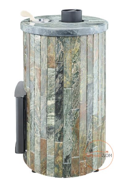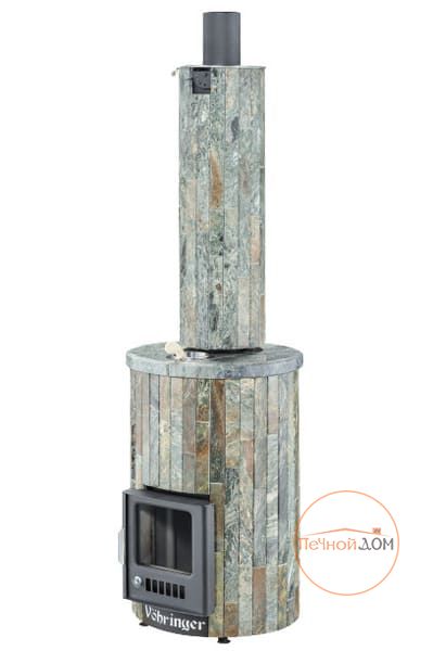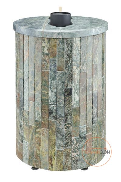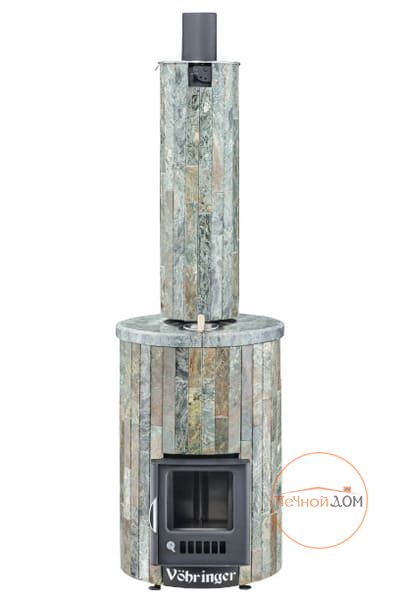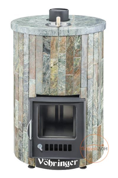 Облицовка печи – ламели из натурального камня, установленные вокруг всего корпуса. Камень блокирует распространение инфракрасного излучения, защищает парильщиков от случайного прикосновения к раскаленному металлу топки. Производство ламелей ведется по собственной запатентованной технологии завода Vöhringer.