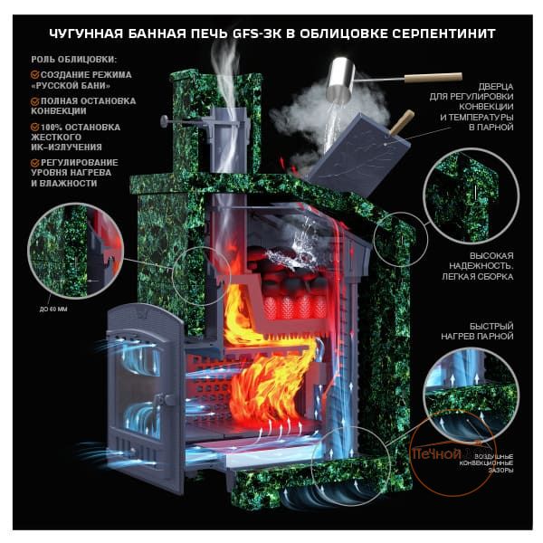 GFS-ЗК 30 - печь с усиленной каменкой большей массы, с единым углублением внутрь топки для дополнительной укладки чугунного заряда. Теплосъемные шипы, со стороны горения пламени, в разы увеличивают площадь соприкосновения огня с каменкой и ускоряют передачу тепла, а также способствуют лучшему дожигу смешивая потоки пламени и воздуха поступаемого из воздушника. Эти усовершенствования значительно повышают мощность парообразования печи и выдают большее количество пара при непрерывной подаче воды. Каменка печей GFS-ЗК является незаливаемой.