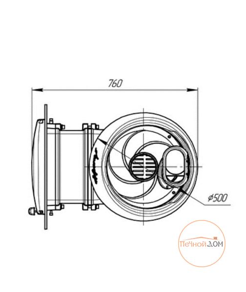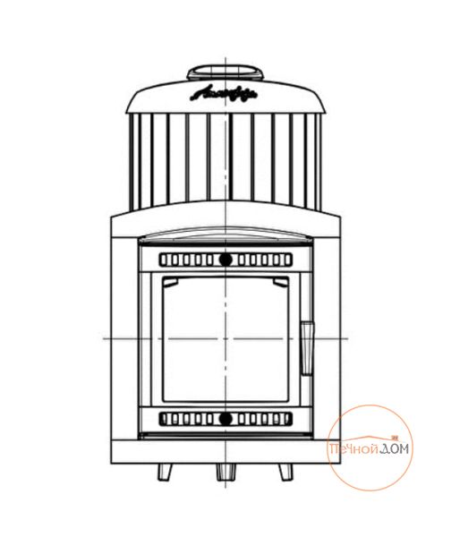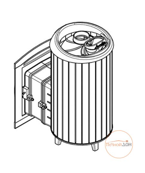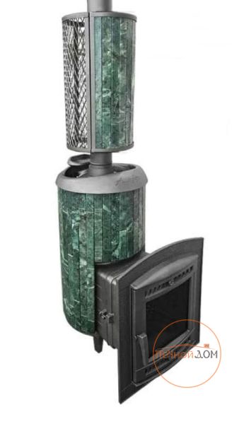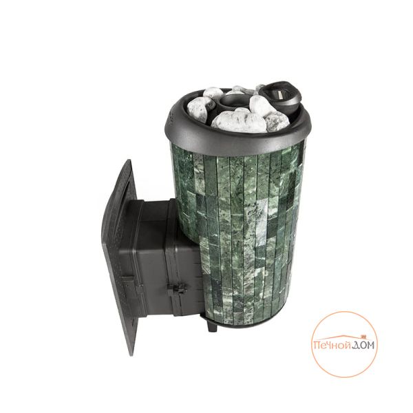 Форма топки с винтовыми каналами закручивает пламя, пламя совершает 3 оборота по топке,а не сразу уходит в трубу, тем самым увеличивая КПД печи на 30%. Два отверстия в топочной дверке для подачи воздуха на горение дают возможность регулировки подачи воздуха, для выбора колосникового и подового горения и позволяют эксперементировать с режимами подготовки парной и выбором процедуры парения. Колосниковое дно с отверстиями позволяет получить равномерное горение по всей площади дна, полноценный прогрев боковых стенок без зон локального перегрева. Подача воды в каменку осуществляется через удобную заливную горловину. Вода проходит через специальный разбрызгиватель внутрь закрытой каменки, где происходит мелкодисперсное орошение горячих камней.