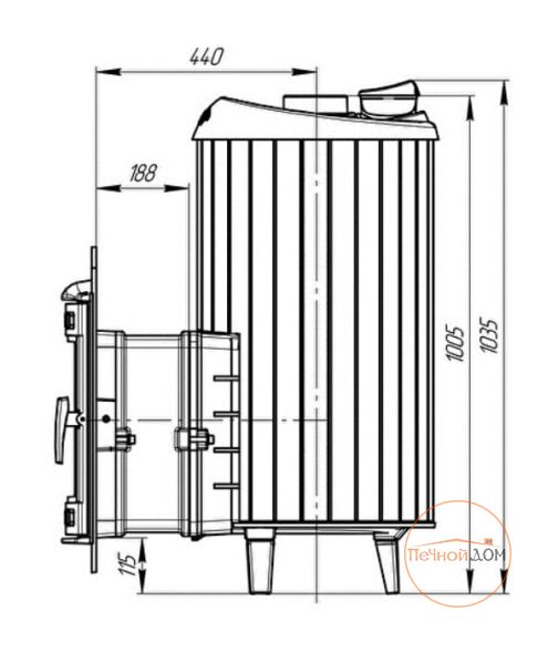 Большой объем топки и топливного тоннеля позволяет топить печь крупными, долго горящими дровами длиной от 40 см