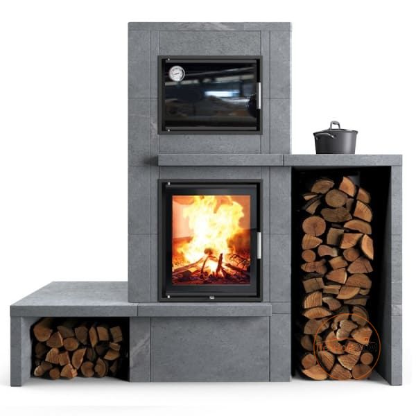 малоэтажных коттеджей и для приготовления еды. Модель печи максимально приближена к Классической деревенской дровяной печи с духовкой. Изделие заводского исполнения. Модель отличается высокой производительностью: благодаря ей можно очень быстро прогревать помещение. Печь имеет особую, тщательно продуманную конструкцию, которая позволяет ускорять распространение теплого воздуха в комнате. Теплоёмкий материал облицовки печи создаёт дополнительный обогрев благодаря лучистому теплу от разогретого камня внешней облицовки.