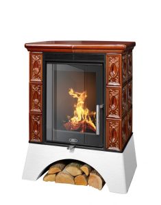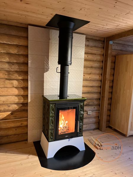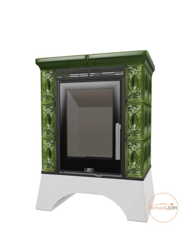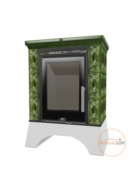 HELVETIA EXclusive внутри топки расположены панели из вермикулита, есть вторичный дожег и система чистое стекло. Стальной цоколь имеет небольшой вес и окрашен белой текстурной краской. Печь имеет дровник в виде полумесяца, по обоим бокам от топки расположены вставки из изразца, есть возможность подключения печи как сверху, так и сзади. Максимально лаконичная печь с приятными цветами на выбор.