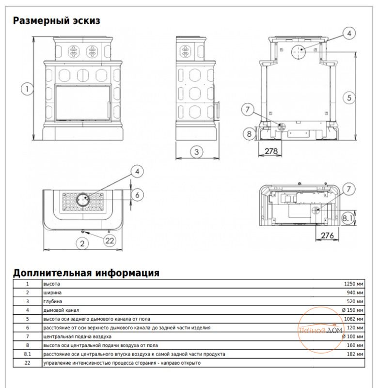 В печи используется абсолютно новая топка подового горения, корпус печи выполнен из легированной стали, футерована вермикулитом или шамотной керамикой белого цвета. Жаростойкое стекло установлено по всей площади двери. Подключение дымохода имеет два варианта.