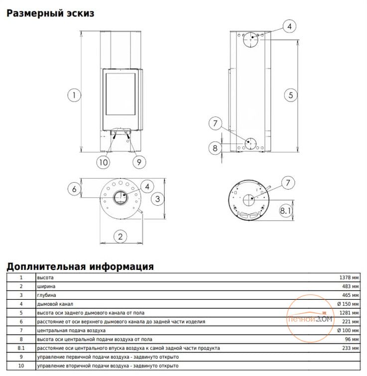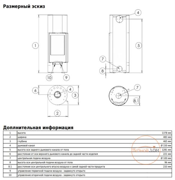Выход дымохода возможен вверху печи и сзади, также есть возможность подвода воздуха на горение с улицы или из подвального помещения. Для увеличения теплоотдачи печи предусмотрен комплект аккумулирующих элементов (опция), которые устанавливаются с веху топки вокруг дымоходной трубы.
