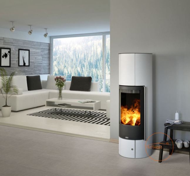 Печь Oregon, от Чешского производителя АВХ, за счет своей цилиндрической формы можно установить как в центре комнаты, так и в углу или около стены. Металлический корпус, окрашенный в жемчужно-белый цвет, значительно уменьшает вес печи, по сравнению с кафельной облицовкой, в результате получаем общий вес всего 100 кг и не высокую стоимость. Топка выполнена из высоколегированной стали и футерована вермикулитом, имеет функцию очистки стекла и вторичных дожег дымовых газов. Большая дверца, с панорамным стеклом, позволяет увеличить угол обзора пламени, а металлическая часть двери закрывает зольный отсек с выдвижным ящиком. Внизу печи есть дверца с магнитным замком, которая скрывает две регулировки подачи воздуха первичного и вторичного.