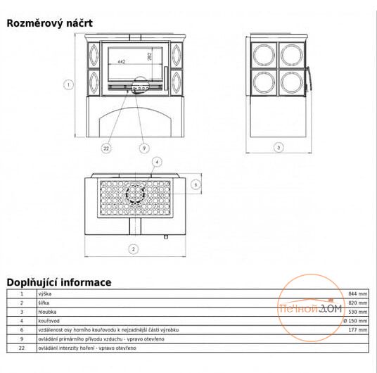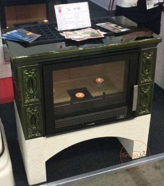 Топка печи выполнена из долговечной и высококачественной стали, через стекло удобно присматривать за огнем и любоваться играми пламени. Огнеупорное стекло (стеклокерамика) выдерживает температуру до 750 градусов. Вес печи в 125 кг, это небольшой вес, поэтому не требуется дополнительное усиление пола под печь, однако если у вас в доме тонкий деревянный пол на лагах с большим шагом, то тогда придется разобрать участок, где будет стоять печь и усилить основание. Кафельная облицовка печи очень долговечна, не подвержена старению и выдерживает высокие перепады температур. Вермикулитная облицовка дна и стенок топки предохраняет сварную конструкцию от воздействия тепловой нагрузки. Топка печи имеет систему вторичногo дожига. Главная особенность системы вторичного дожига заключается в следующем, сначала сгорают дрова, а затем остаточные продукты горения, это дымовые газы с твердыми частицами. Уменьшая приток воздуха или увеличивая его подачу, можно добиться оптимальной интенсивности горения.