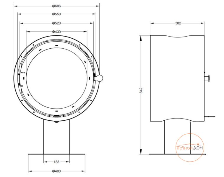 Нестандартный вид печи-камина D 600, круглая дверца и подовое горение — вот отличительные особенности этой модели.