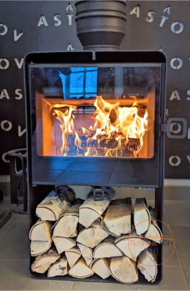 Минималистичный корпус печи-камина имеет встроенный дровник и изготовлен из стали, которая окрашена в чёрный цвет.