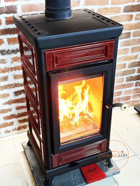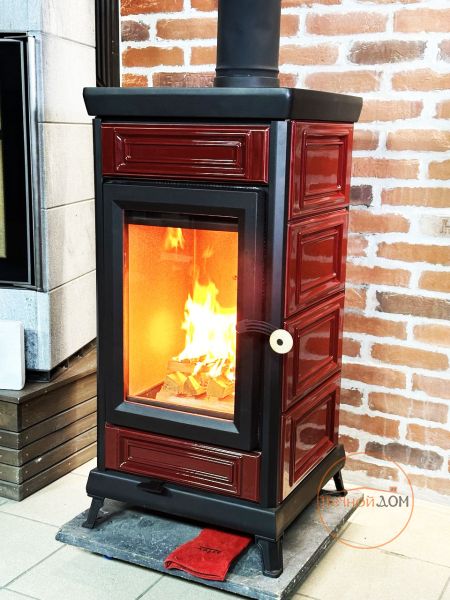 Она обладает ярким и запоминающимся дизайном с панорамным окном и имеет чугунную плиту с возможностью готовки.