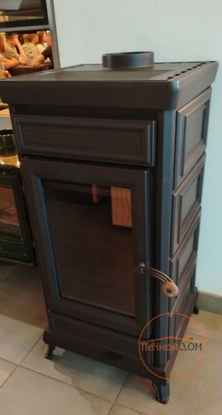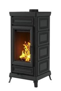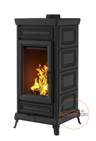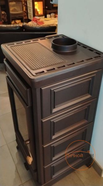 Обладает ярким и запоминающимся дизайном с панорамным окном и имеет чугунную плиту с возможностью готовки.