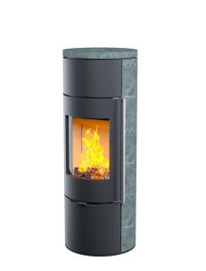 Круглая печь-камин R1.0 L K с высотой 1389 мм и каменными панелями c максимальной панорамой пламени создает прекрасный вид на огонь из любой точки помещения.