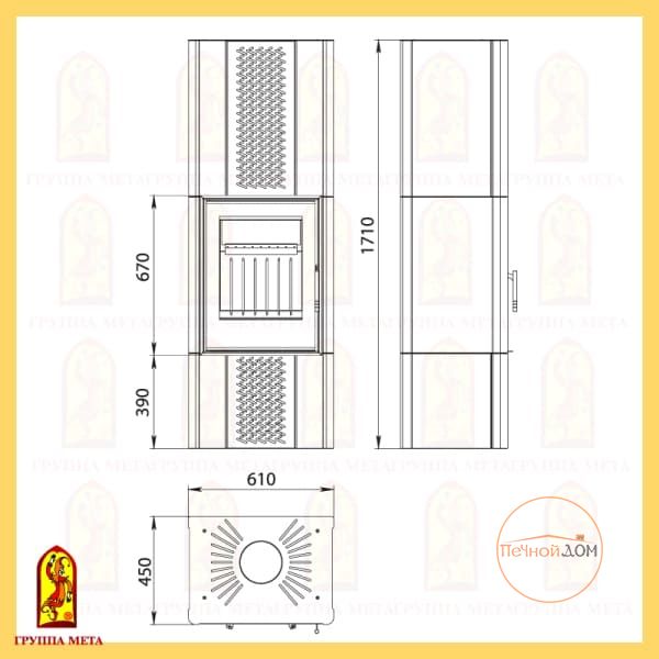 Быстрый нагрев помещения происходит за счет большого количества конвекционных решеток, вертикально размещенных по всей высоте печи.