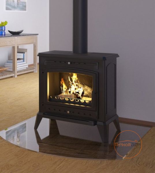 Стенки печи сделаны из высококачественного чугуна. Внутри топки находится отбойник пламени, который препятствует уходу огня прямо в дымоход, заставляя сделать оборот, что увеличивает КПД печи. А система подачи вторичного воздуха дожигает улетающие в трубу частички топлива, благодаря чему образуется меньше золы и дольше остается чистым дымоход.
