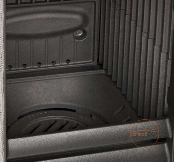 Дверца печи открывается в сторону. Большое керамическое стекло дверцы выдерживает температуру до 750ºС. Система «чистое стекло» позволяет беспрепятственно любоваться видом огня. Также печь обладает механизмом бесшумного подъема дверцы. Размеры проема топки у этой печки составляют 220х215 мм, самой топки 220х370х290 мм.