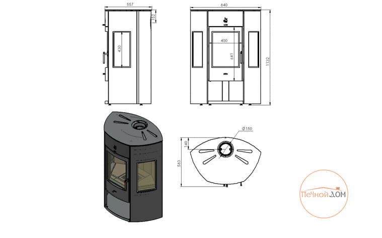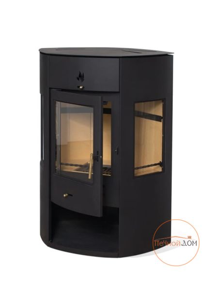 Печь рассчитана на пристенно-угловую установку. Несмотря на внушительные размеры, она не займет много места. Более того, панорамное остекление визуально облегчают конструкцию. Плавные обводы и глубокий матовый черный цвет, в который окрашен металл, добавляют печи изящества.