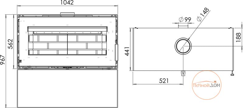 Современная, стильная и мощная печь-камин Монблан предлагает роскошную цельностеклянную переднюю часть и широкое остекление для еще большего удовольствия от огня. Масштабное панорамное стекло размером 1000*520 мм. оформлено черным принтом по периметру. Топка легко вмещает дрова длиной до 800 мм. Ниша под топкой может служить удобным дровником. Дверь снабжена самозакрывающейся системой двойного замка для идеальной герметичности, а дверная ручка является съемной.