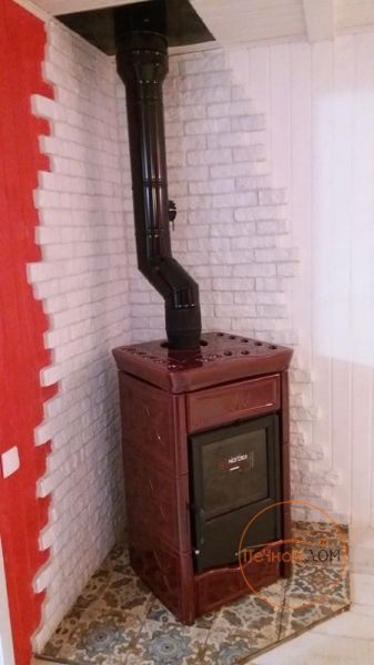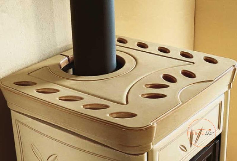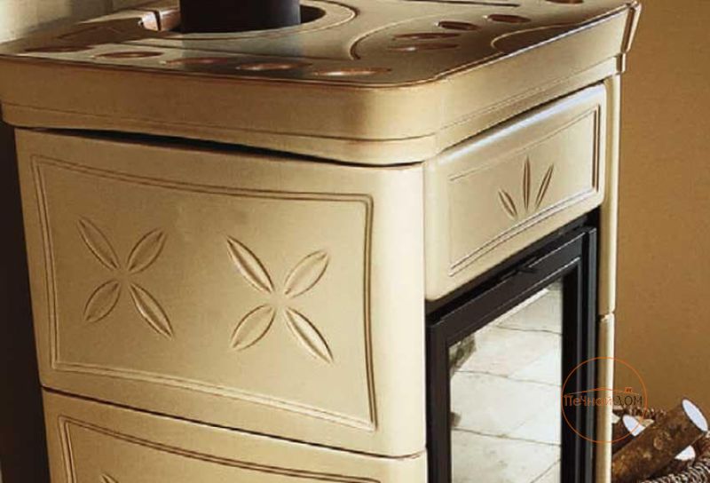 В печь встроен регулятор поступления воздуха, в том числе вторичного и системой дожига вторичного газа. Данная печь имеет верхнее подключение дымохода. Пластина в печи изготовлена из отшлифованного чугуна.