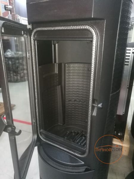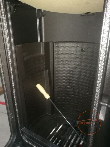 Вместительный зольный ящик, имеющий свободный доступ, оригинально оформленный как часть чугунного корпуса печи. Многоуровневая подача подогретого воздуха обеспечивает эффективное сгорание дров до золы. За счет вертикально вытянутой формы топки, печь прогревается равномерно до высоких температур. В нагреве учавствует большая масса чугунного корпуса, поэтому стена, у которой располагается печь, должна быть защищена негорючими материалами, декоративно отделать можно например керамической плиткой.