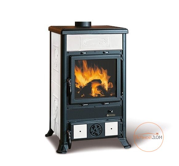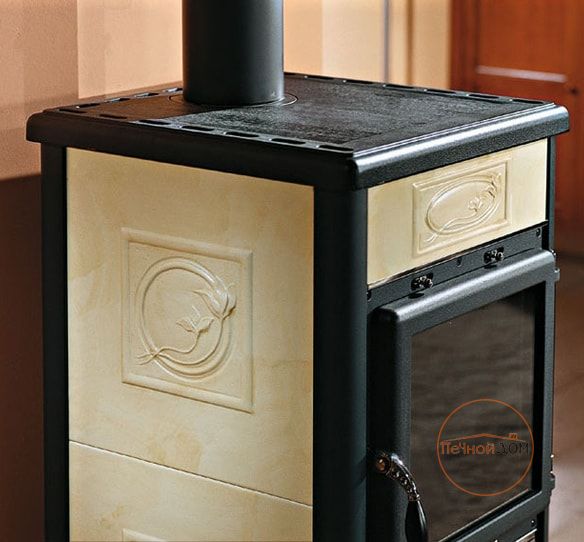 Печь Камин La Nordica Rossella R1 облицована резной плиткой из майолики – разновидностью керамики, выполненной из обожженной глины. Также возможен вариант облицовки стеатитом или, по-другому, мыльным камнем, названного так за его гладкость, схожую на ощупь с мылом. Камень отличается высокой теплоемкостью, он быстро нагревается и медленно остывает. Дверца, верхняя крышка и топка печи выполнены из высококачественного чугуна.