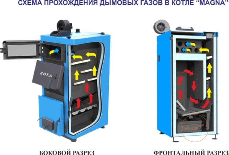 Загрузка топлива производится вручную, а процесс горения поддерживается нагнетаемым с помощью вентилятора воздухом под контролем модуля управления.