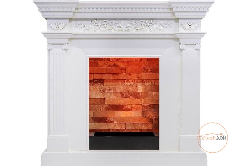Изящный лепниной барельеф украшает фронтон и кронштейны античных колонн, расположенных по бокам портала. Цветочный орнамент придает легкую утонченность строгим линиям обрамления очага, а высокий подиум визуально вытягивает портал и завершает элегантный силуэт камина.