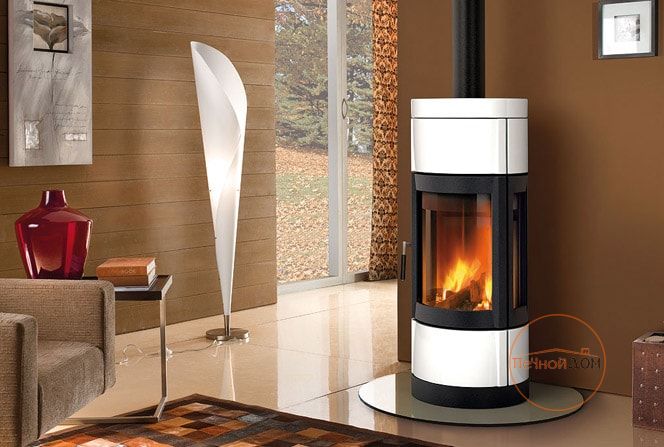Представленная печь-камин на вращающемся основании (Угол вращения - 90 град.). Наружные плиты изготовлены из майолики (цвет - бордо, белый инфинити).