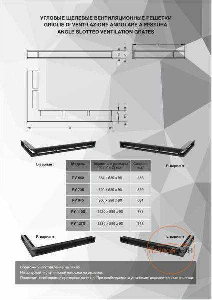 Щелевые вентиляционные решетки предназначаются для равномерного распределения воздуха в больших пространствах и крупногабаритных помещениях. Решетка РУ 1275 L для каминов не только дополнит дизайн отопительного прибора, но и повысит его КПД.