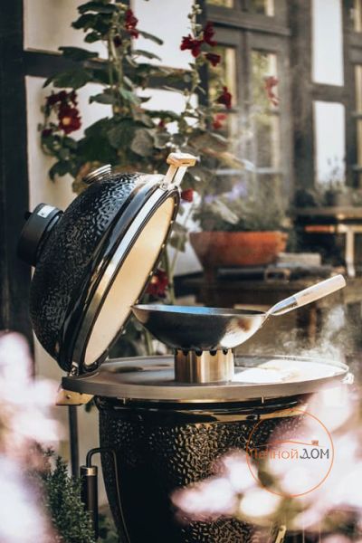 Благодаря эксклюзивной системе подачи ароматной щепы для копчения, Вы сможете безопасно досыпать её в гриль прямо на угли, не открывая крышку гриля и не сбрасывая температуру во время готовки.