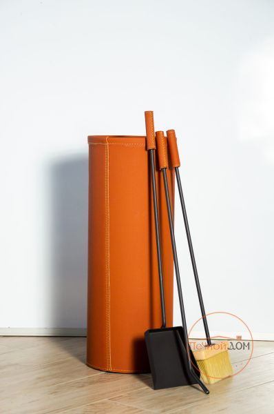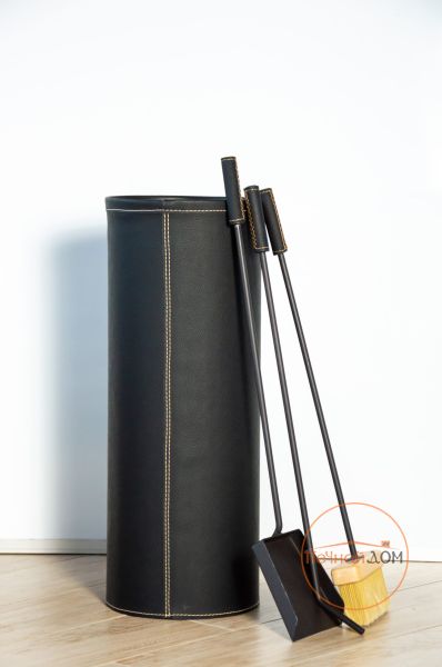 Ведро выполнено из экокожи и предназначено для хранения аксессуаров для камина. В набор входит щетка, совок, кочерга.